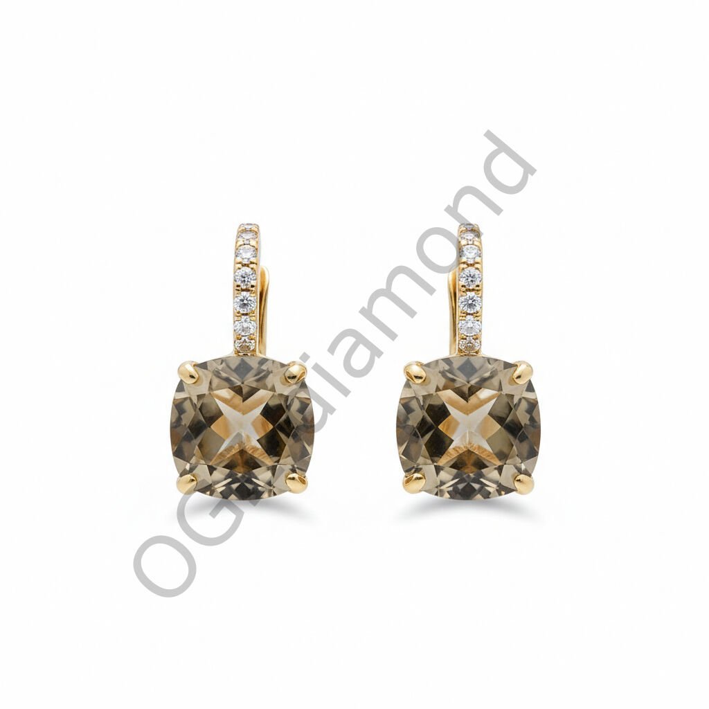 Kare Kesim Dumanlı Kuvars ve Pırlanta Dizili Altın Küpe - PK0000943
