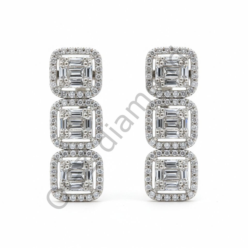 Üçlü Baget Pırlanta Dizili Beyaz Altın Sallantılı Küpe - PK0001106