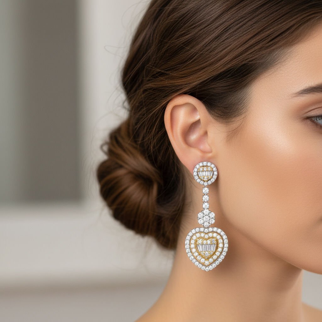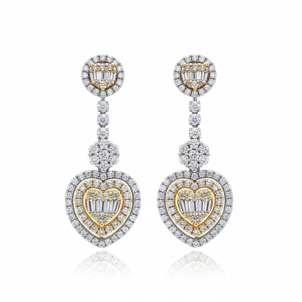 Baget ve Yuvarlak Kesim Pırlanta Kalp Sallantılı Küpe - PK0001217