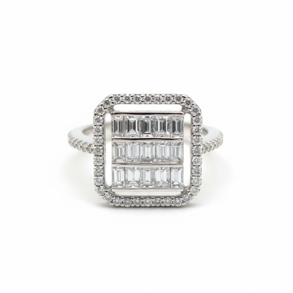 Art Deco Koleksiyonu: Geometrik Baget ve Yuvarlak Pırlanta Dizimli Beyaz Altın Modern Yüzük - PY0002725