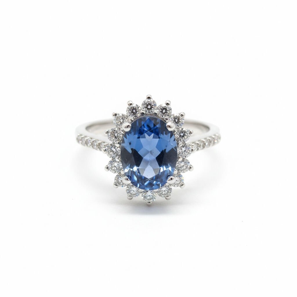 Beyaz Altın Oval Safir Taşlı Pırlanta Halo Nişan Yüzüğü - PY0002727